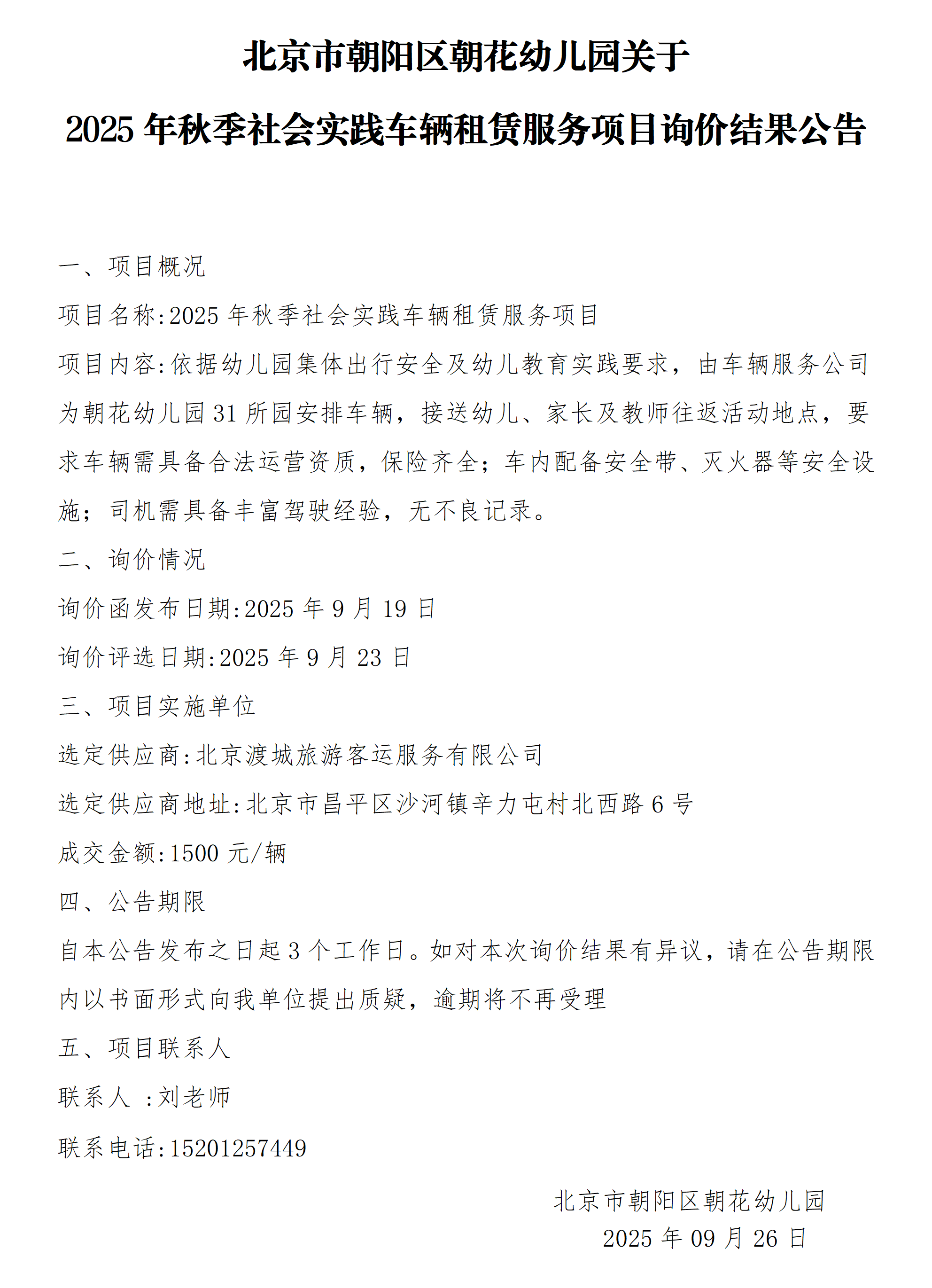 北京市朝阳区朝花幼儿园2025年秋季社会实践车辆租赁服务项目询价结果公告