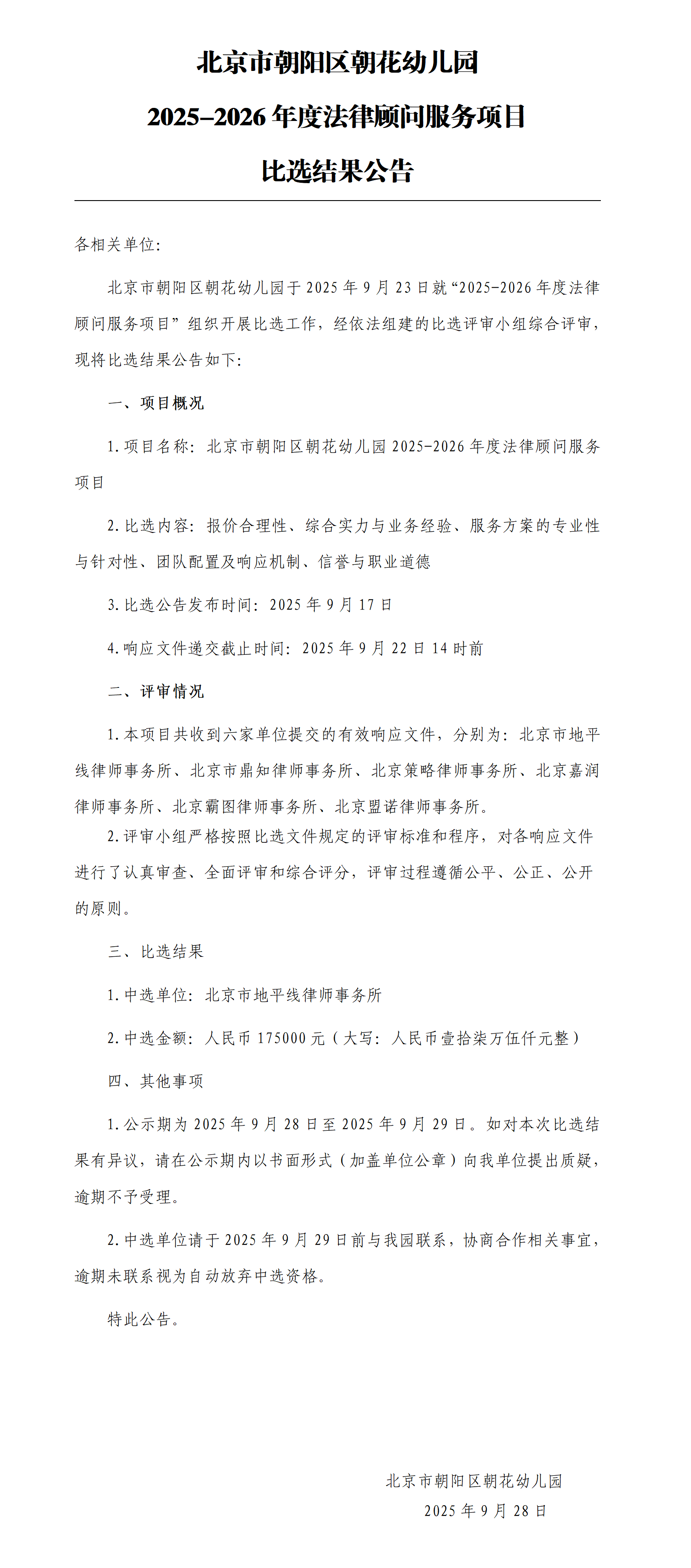 北京市朝阳区朝花幼儿园2025-2026年度法律顾问服务项目比选结果公告