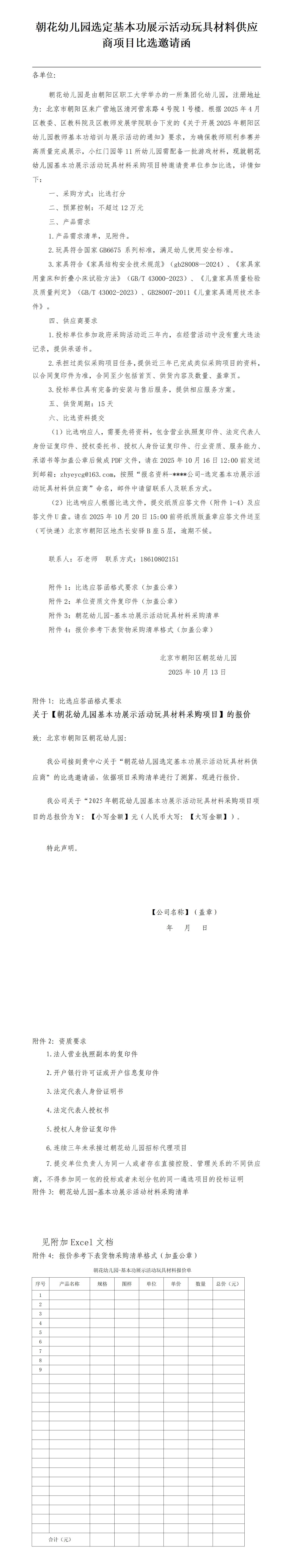 朝花幼儿园选定基本功展示活动玩具材料供应商项目比选邀请函