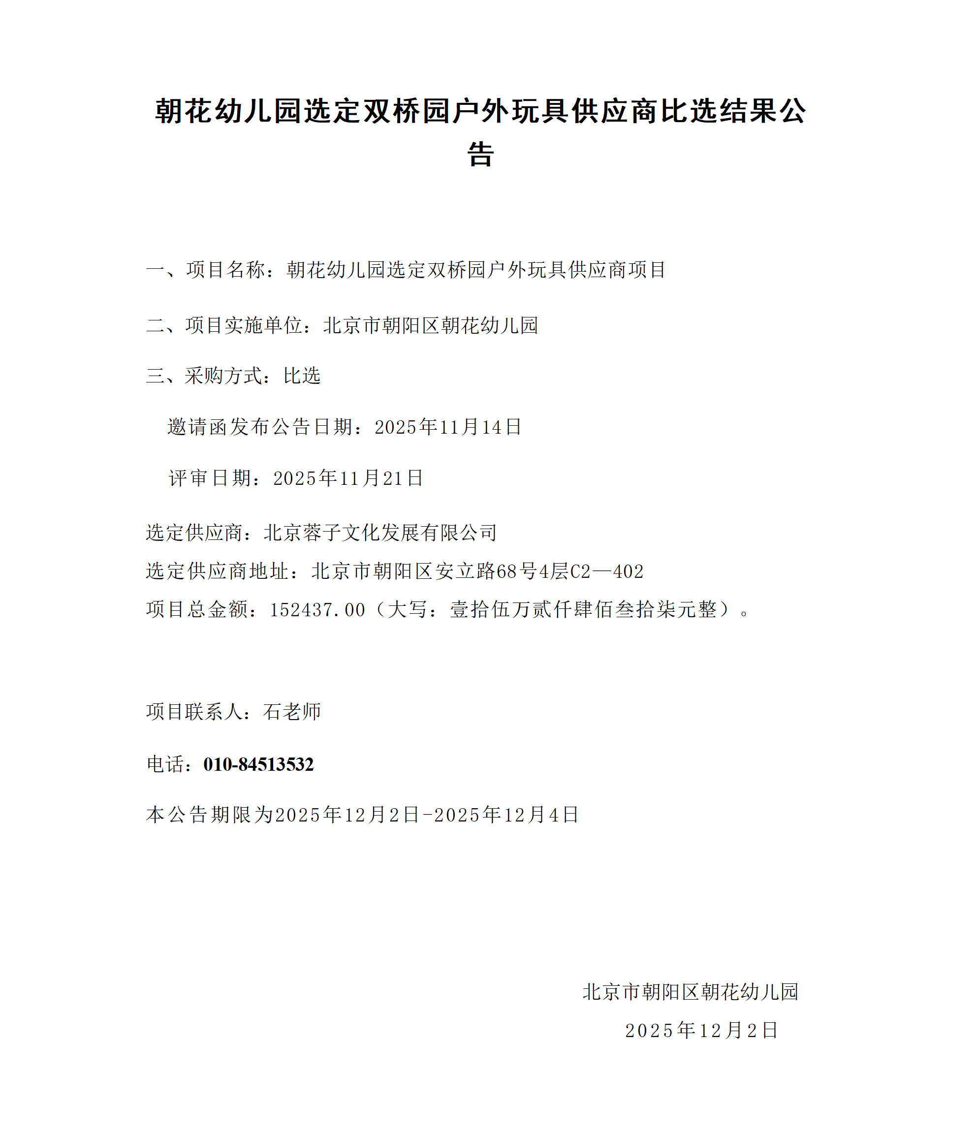 北京市朝阳区朝花幼儿园选定双桥园户外玩具供应商比选结果公告