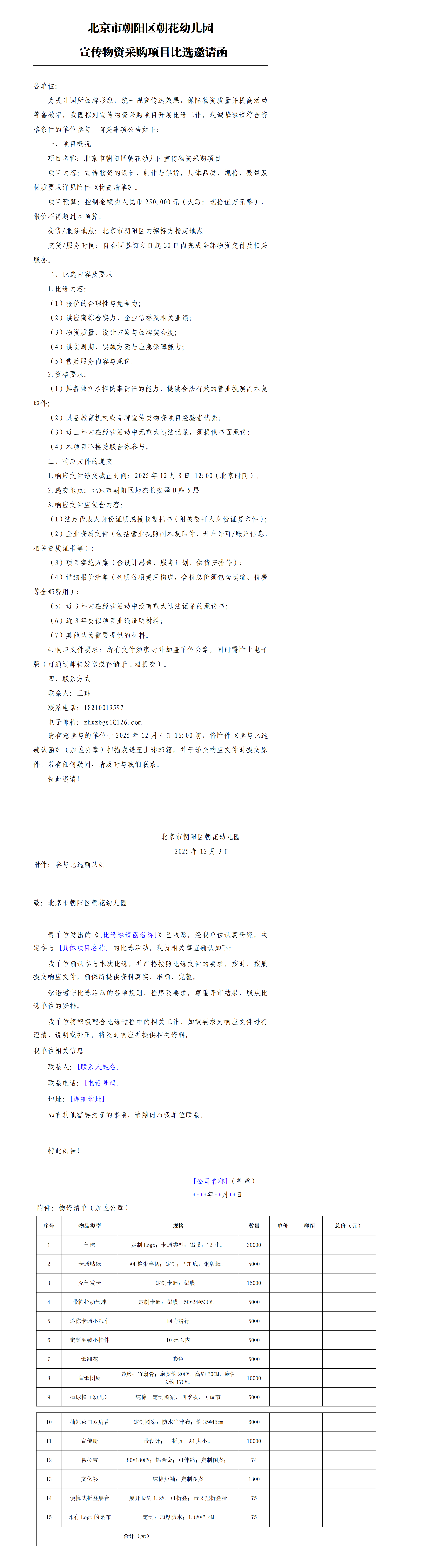 北京市朝阳区朝花幼儿园宣传物资采购项目比选邀请函
