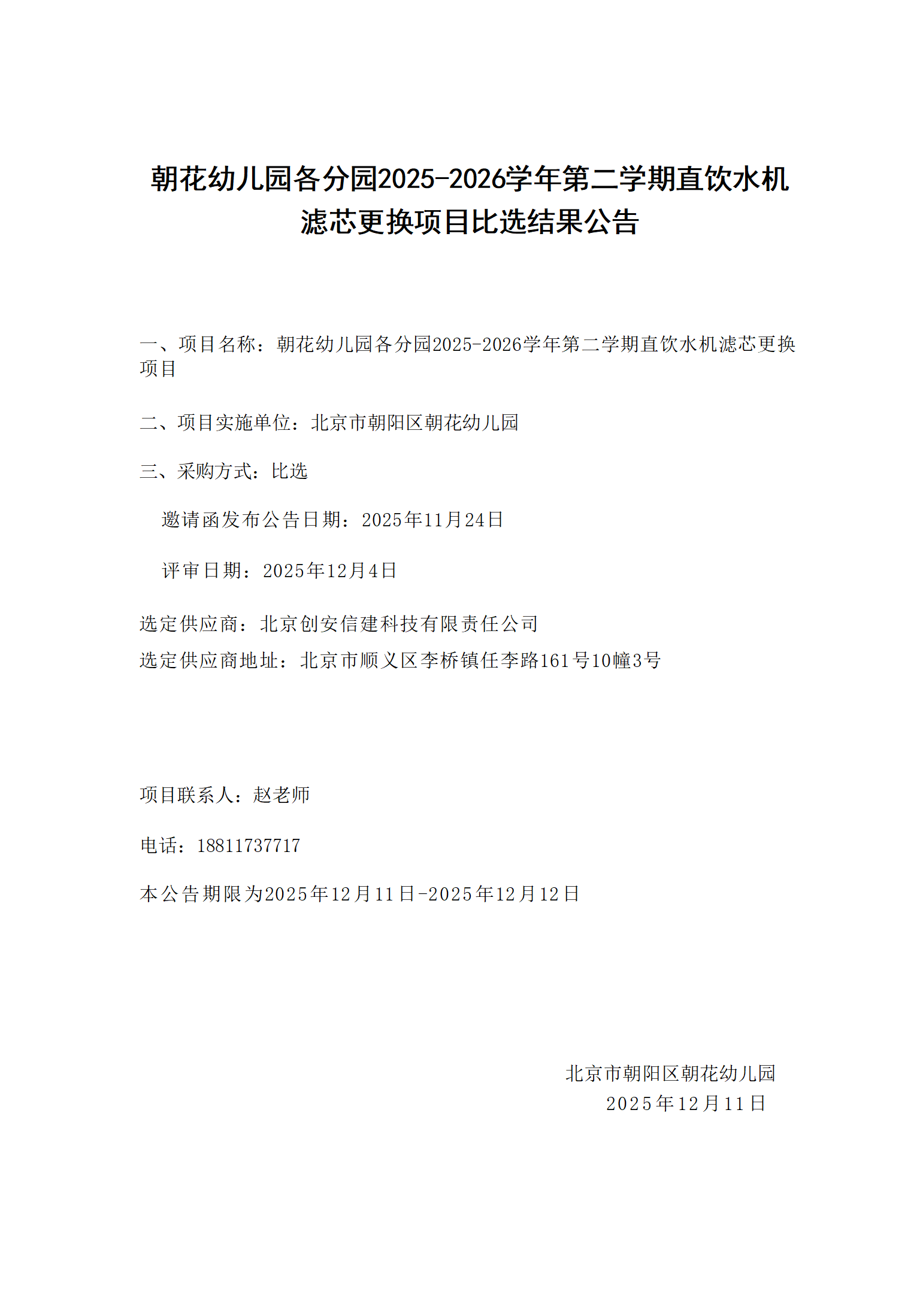 朝花幼儿园各分园2025-2026学年第二学期直饮水机滤芯更换项目比选结果公告