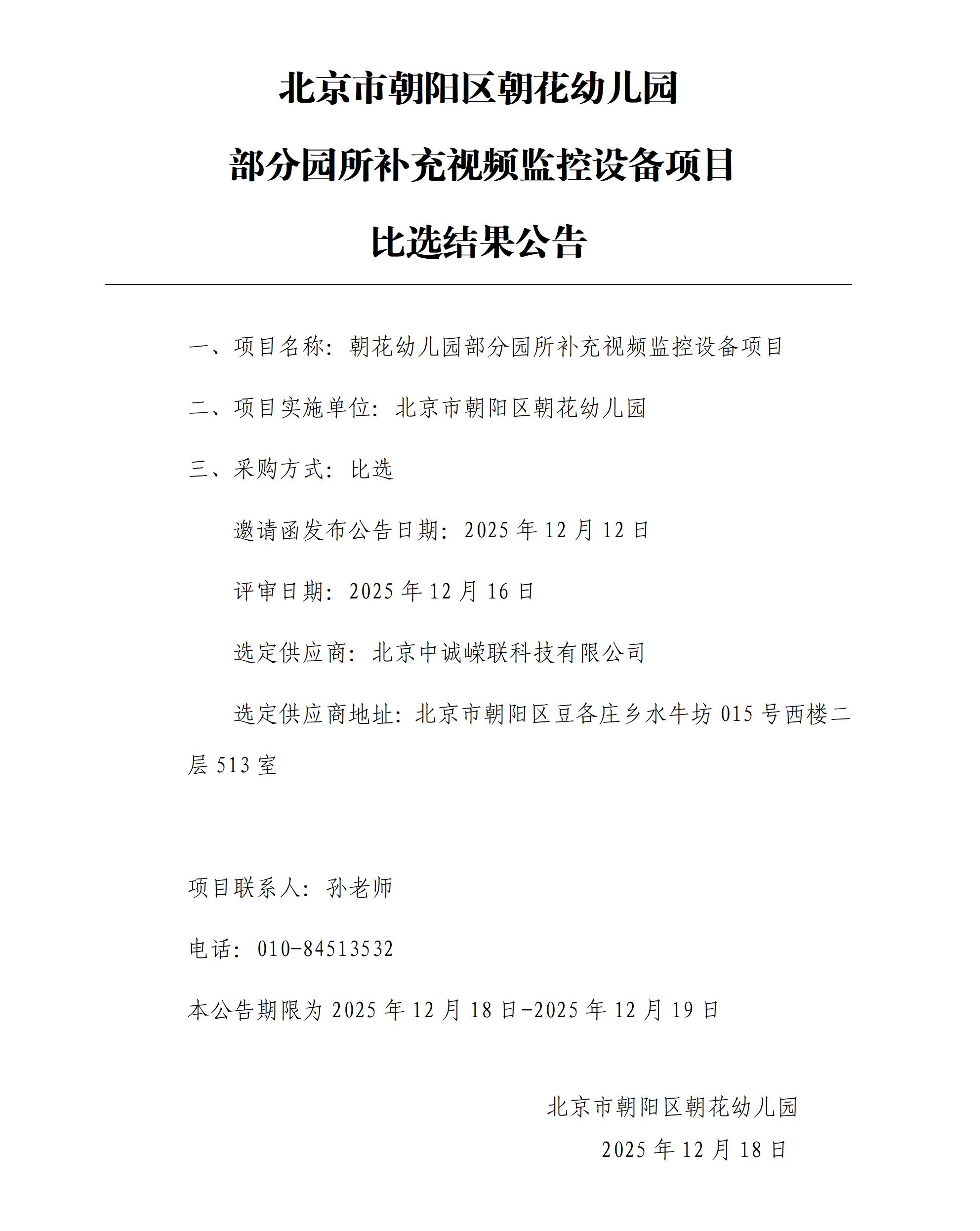 北京市朝阳区朝花幼儿园部分园所补充视频监控设备比选项目结果公告