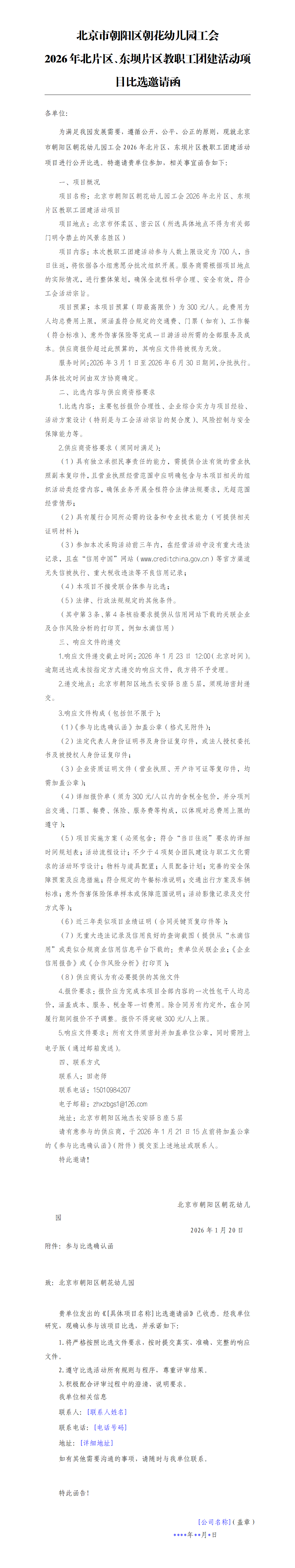 北京市朝阳区朝花幼儿园工会2026年北片区、东坝片区教职工团建活动项目比选邀请函