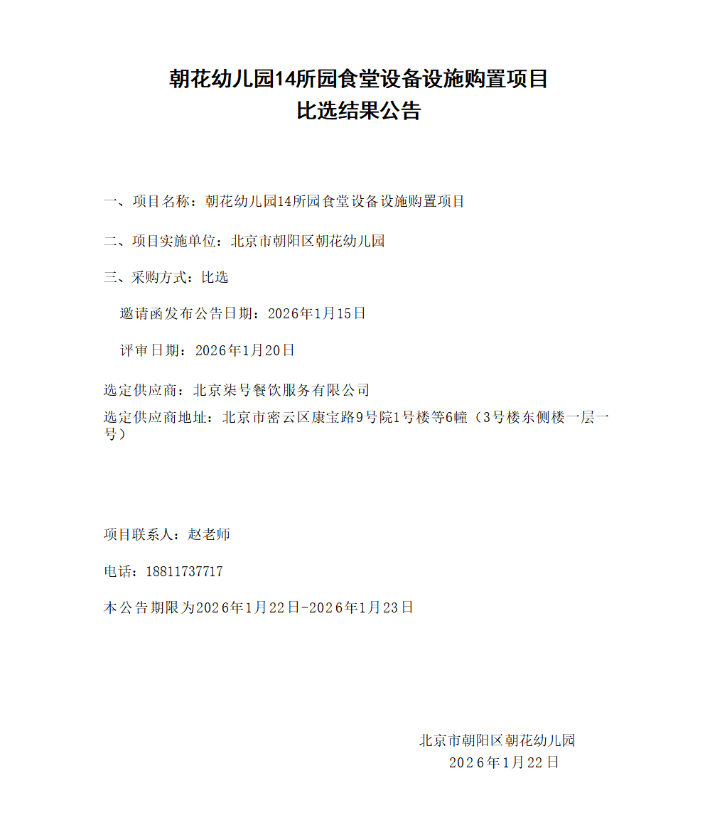 北京市朝阳区朝花幼儿园14所园食堂设备设施购置项目比选结果公告