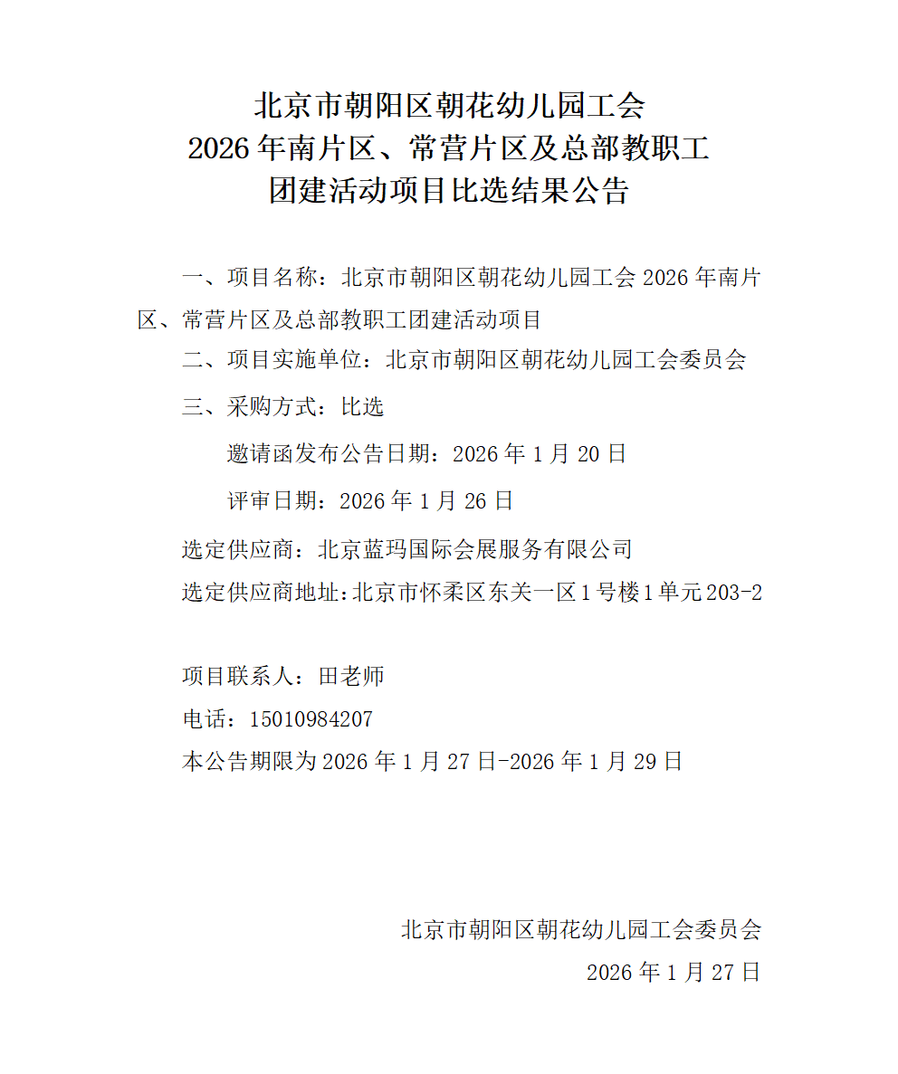 北京市朝阳区朝花幼儿园工会2026年南片区、常营片区及总部教职工团建活动项目比选结果公告