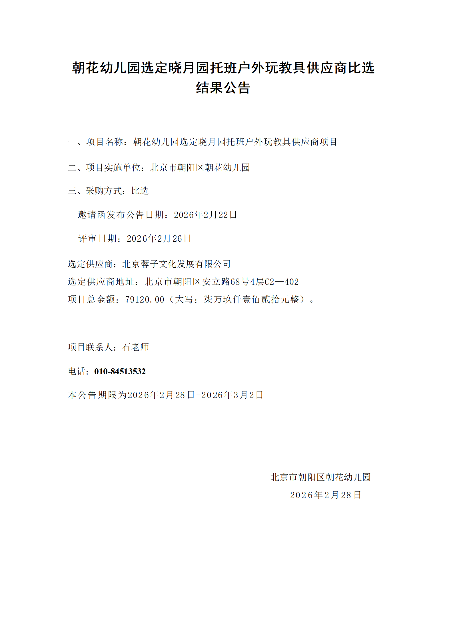 朝花幼儿园选定晓月园托班户外玩教具供应商比选结果公告