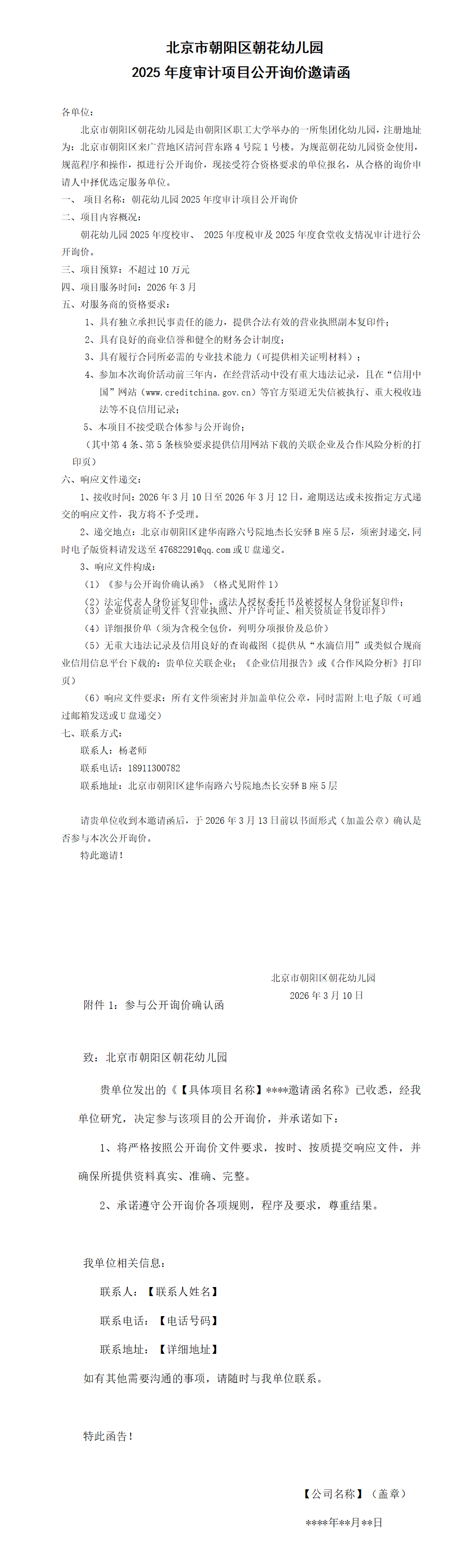北京市朝阳区朝花幼儿园2025年度审计项目公开询价邀请函
